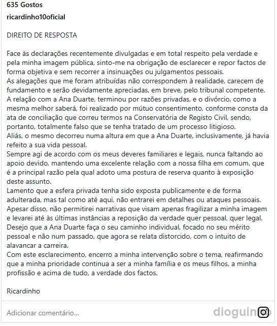 Ricardinho aproveitou o comunicado para esclarecer os factos sobre o fim do seu casamento com Ana Duarte. Ele refutou a ideia de que o processo de divórcio tenha sido litigioso, afirmando que foi realizado “por mútuo consentimento”, conforme consta na ata de conciliação. Além disso, sublinhou que a separação ocorreu quando Ana Duarte já havia “refeito a sua vida pessoal.”