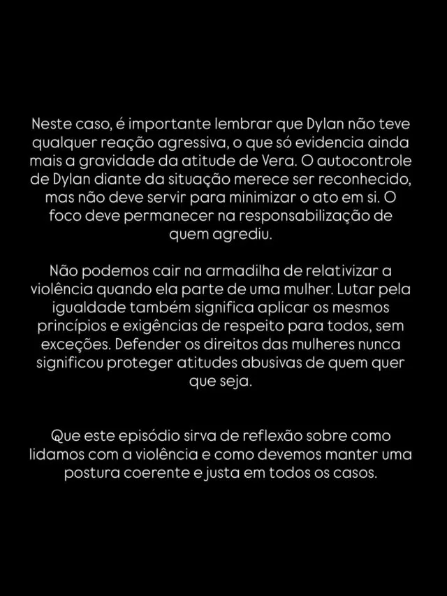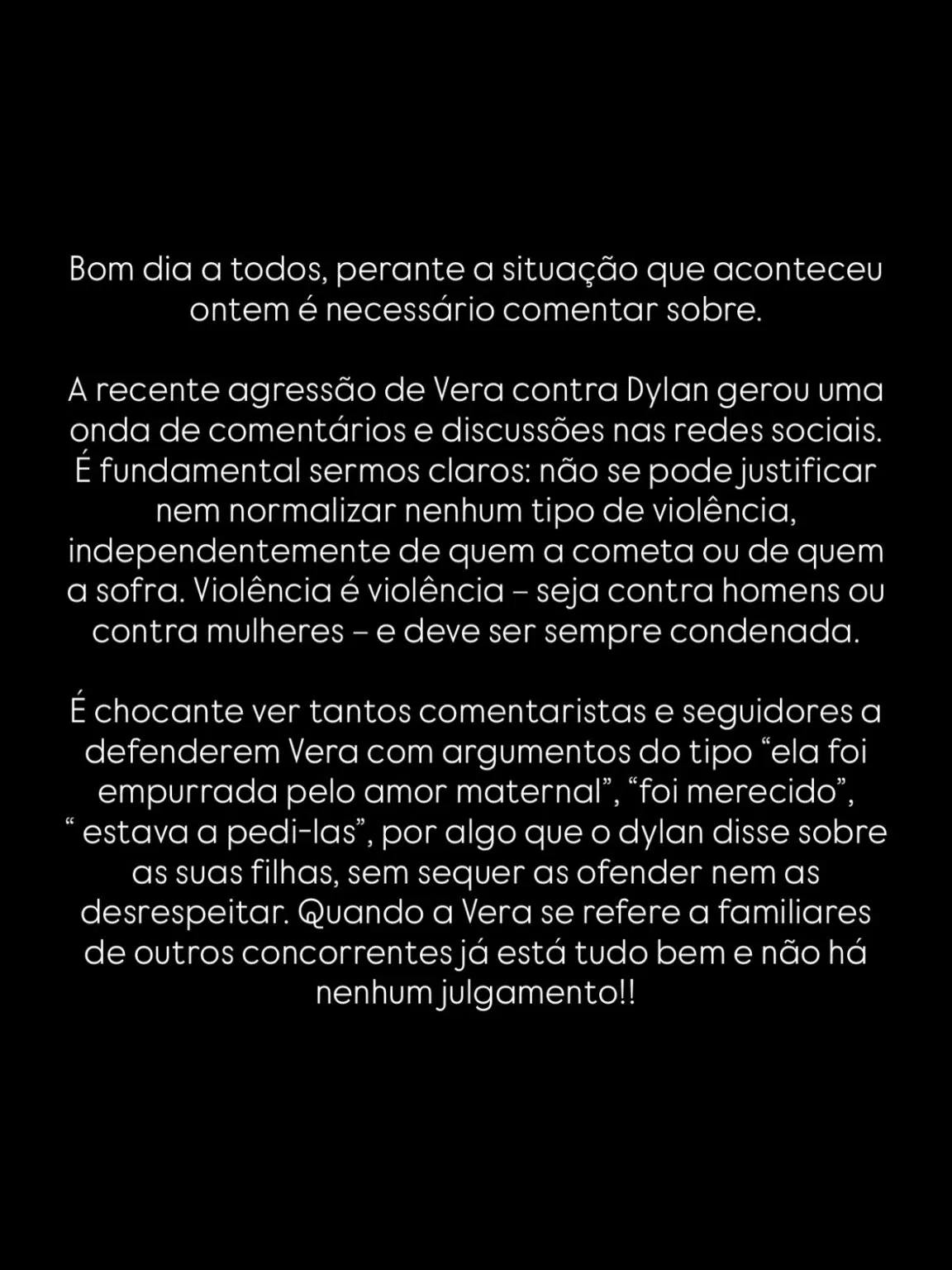 “É chocante ver tantos comentaristas e seguidores defenderem a Vera com argumentos do tipo ‘ela foi empurrada pelo amor maternal’, ‘foi merecido’, ‘estava a pedi-las’, por algo que o Dylan disse sobre as suas filhas, sem sequer as ofender nem as desrespeitar. Quando a Vera se refere a familiares de outros concorrentes já está tudo bem e não há nenhum julgamento,” acrescentaram.