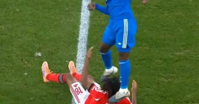 O incidente, ocorrido num momento de disputa intensa no meio-campo, foi descrito como um dos momentos mais arrepiantes da partida:
